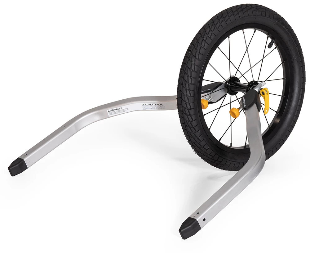 Le Burley Jogging Set Double avec une roue à rayons de 16″, bras de roue inclus, transforme votre remorque à vélo en un confortable jogging pour enfants.