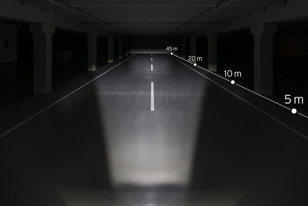 “Avec lumière à faible distance” signifie que le champ lumineux émis par nos phares commence directement à un mètre devant le vélo.