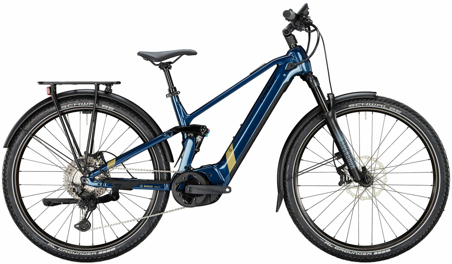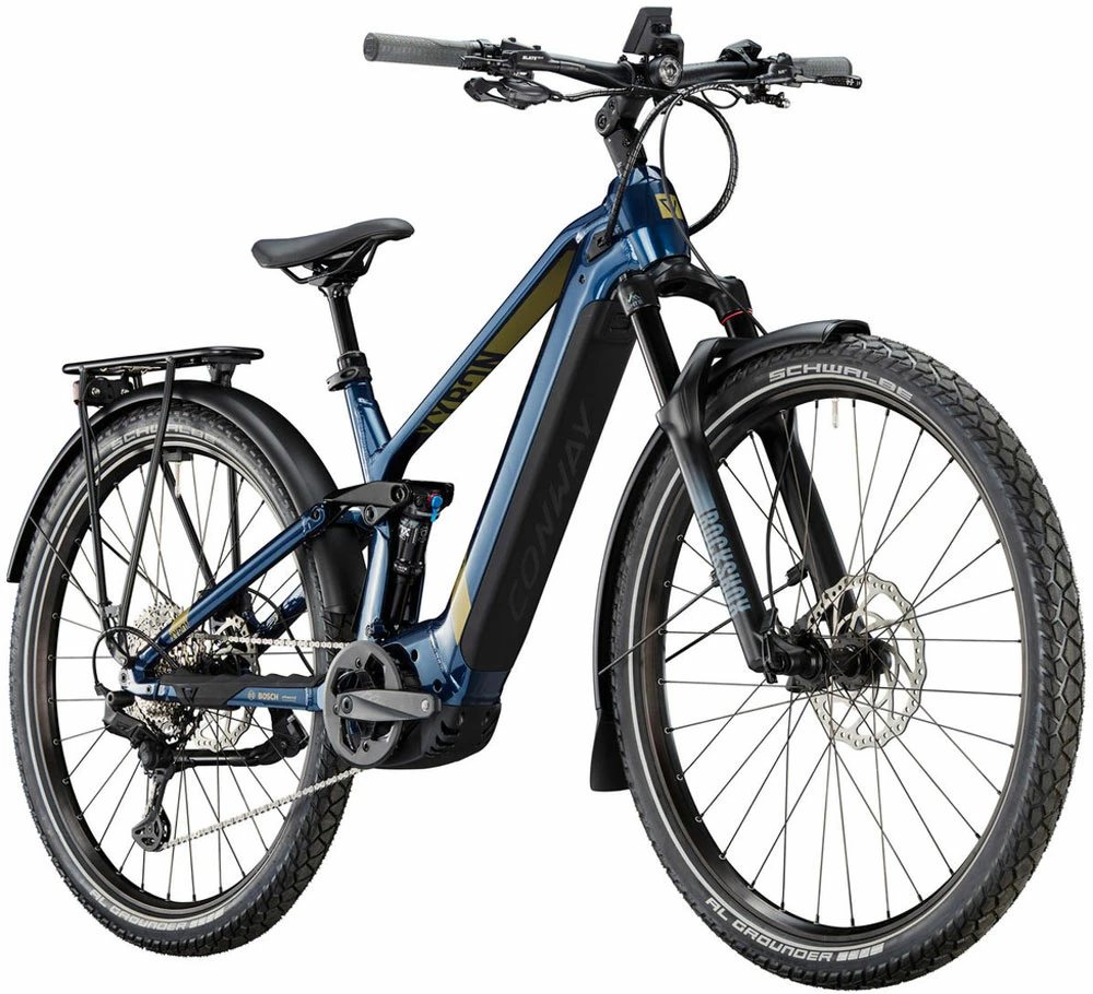 The Conway Xyron SUV 6.9 is probably the most comfortable and yet most suitable E-MTB for everyday use. Equipped with lights, a rear rack and mudguards, it combines the comfort of an e-fully with the practicality of an urban bike. It impresses with a powerful Bosch Performance CX Gen 4 motor. The 750 Wh battery reliably supplies you with the necessary power so that you can enjoy your time on your bike for even longer.
