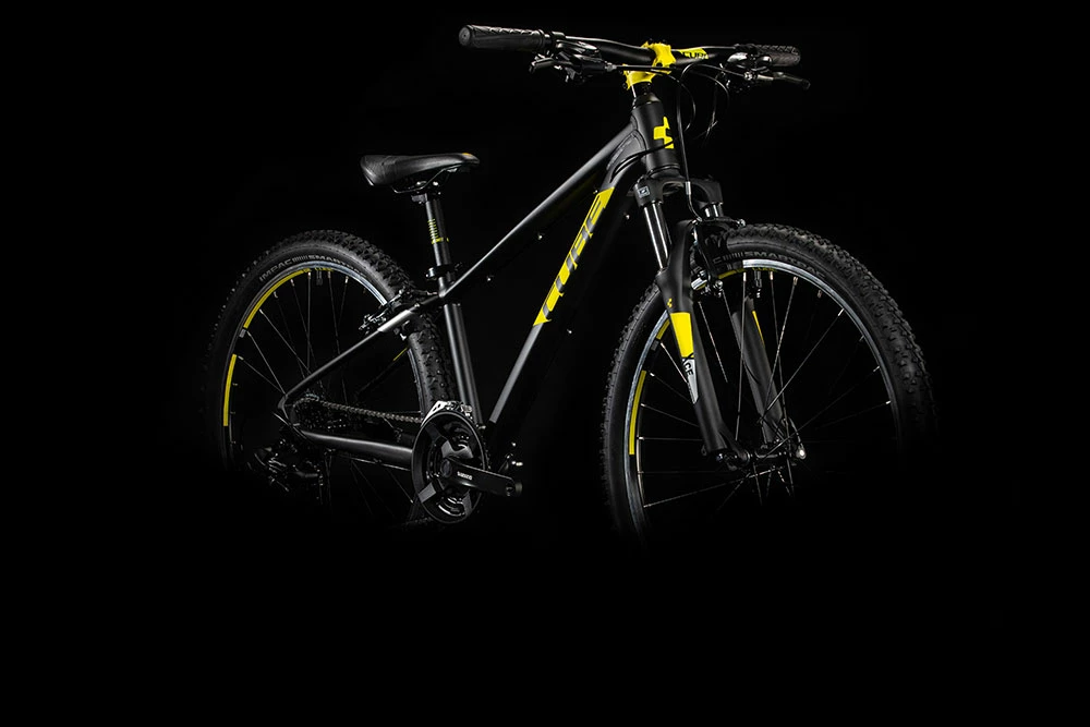 It uses the same mechanical tube forming process as our full-size bikes and, as you’d expect, the 6061 aluminium chassis has passed all our in-house tests to ensure it’s strong, durable and safe in the hands of your youngsters. Internal cable routing reduces clutter and maintenance, and there’s an integrated kickstand mount so you can add this handy extra without ruining the bike’s clean looks. The Suntour XCT suspension fork has 80mm of bump-absorbing travel for rough trails, and the 24-speed Shimano gears cover a wide range to put every climb within reach. Light, powerful and easy to adjust V-brakes keep it all in control, and grippy tyres help keep the rubber side down. It’s every inch a proper mountain bike, for your proper little mountain biker.