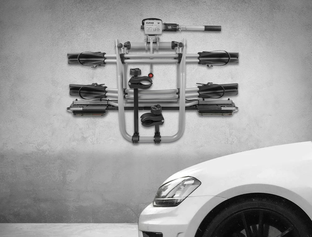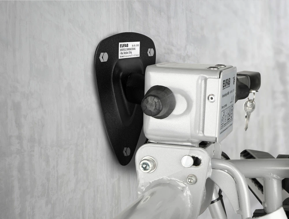 Le support mural EUFAB permet de ranger un porte-vélos sur le crochet d’attelage en économisant de la place. Il suffit de le fixer intelligemment au mur pour qu’il accepte une charge utile maximale de 30 kg.