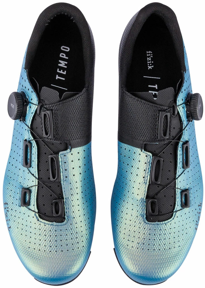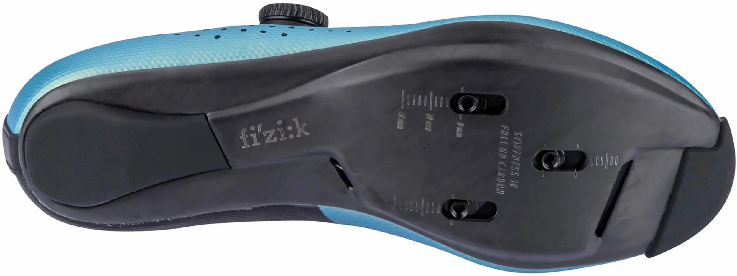 La semelle extérieure R2 est en fibre de carbone, ce qui permet de gagner du poids et d’augmenter la rigidité. Avec un indice de rigidité de 10, cette semelle est la plus réactive de toute la gamme Fizik. Une large fente d’aération et des canaux d’air internes profonds assurent un flux d’air optimal et aident à réguler la température. Le positionnement des crampons est légèrement plus en arrière par rapport aux semelles conventionnelles afin d’optimiser l’efficacité du pédalage et de réduire la pression sur les genoux – particulièrement bien adapté aux positions aérodynamiques très agressives et orientées vers l’avant.
