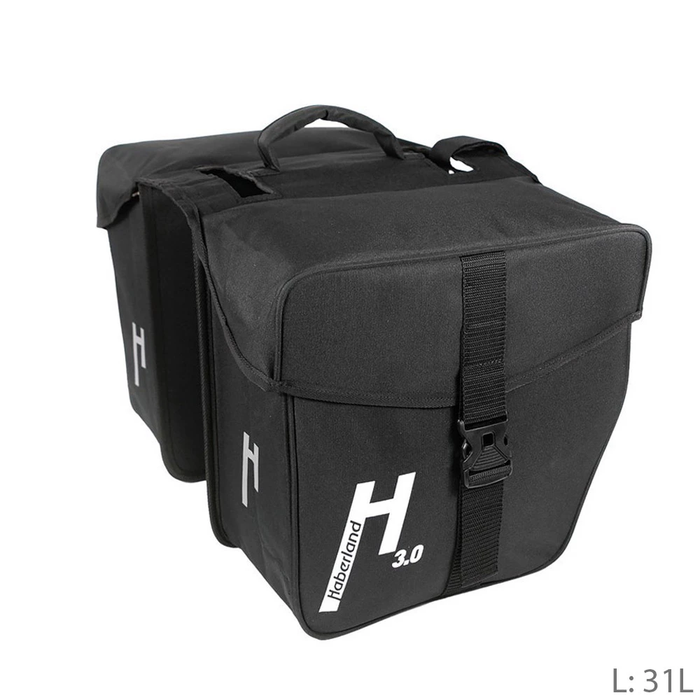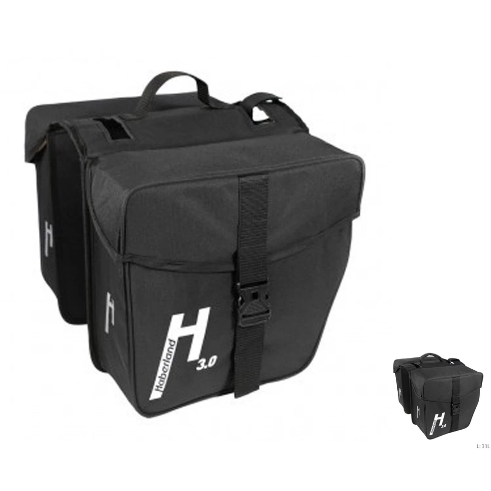 - Une bande Velcro supplémentaire permet de fixer le double sac sur le porte-bagages. Ainsi, la fixation est également possible sans le rabat à ressort