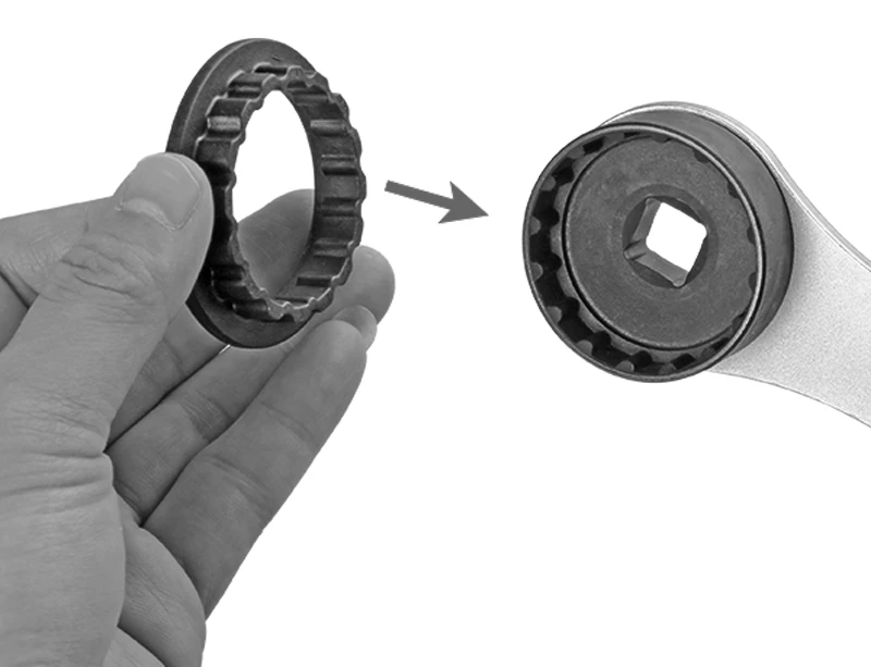 - La clé à capuchon anti-poussière fournie s’engrène dans les 8 dentures intérieures du vissage du boîtier de pédalier