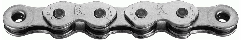 La chaîne singlespeed K1 Narrow de KMC avec surface nickelée pour BMX, système de moyeu à vitesses intégrées et autres systèmes singlespeed nécessitant une transmission directe de la puissance.