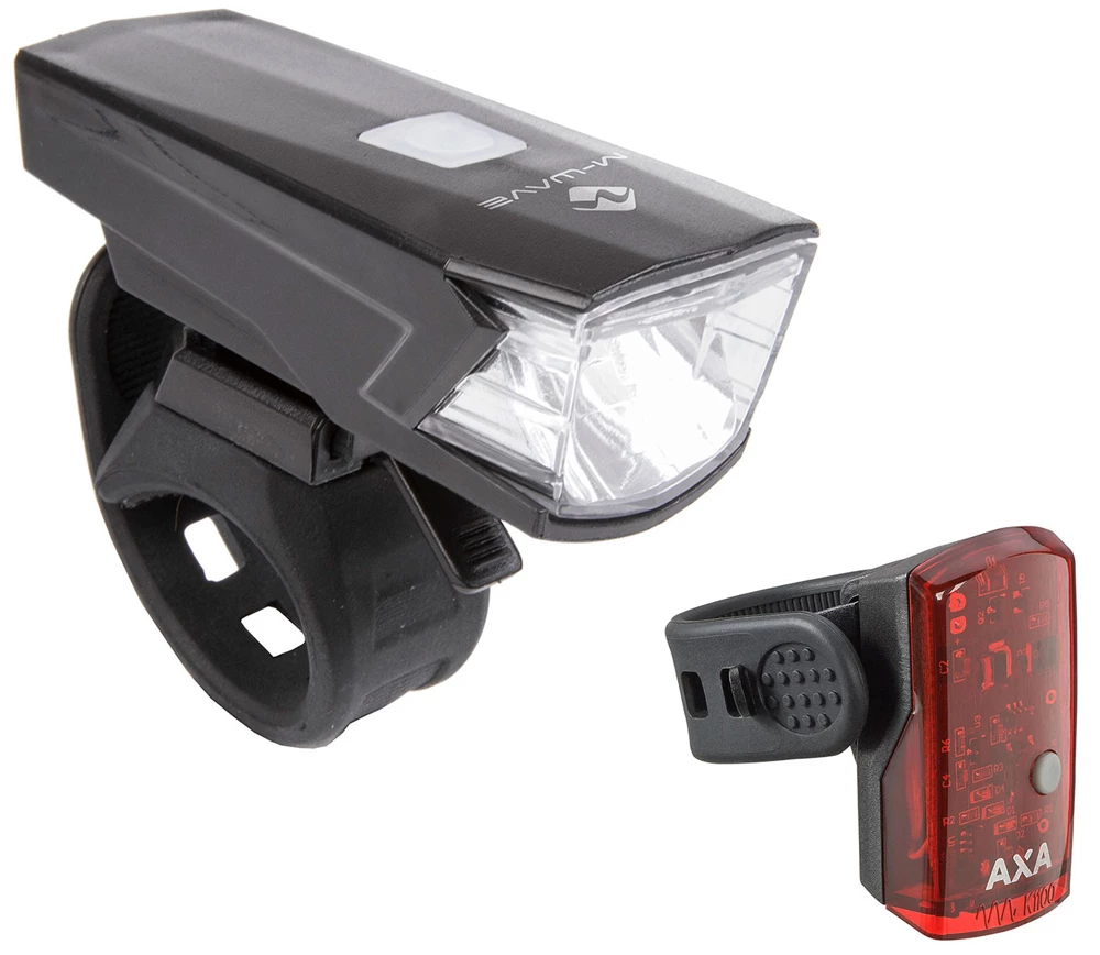 Le kit d’éclairage USB avec homologation StVZO et batteries intégrées se compose d’un feu avant M-Wave Apollon K30 et d’un feu arrière Axa Greenline 1 LED.