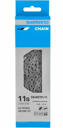 La chaîne de type HG701-11 de Shimano est directionnelle et présente une durabilité accrue grâce au traitement SIL-TEC sur les plaques extérieures et intérieures. La chaîne HG-X11 de haute qualité peut être utilisée sur les vélos de course à 11 vitesses, les VTT et, grâce à sa construction renforcée, également sur les VTT électriques.