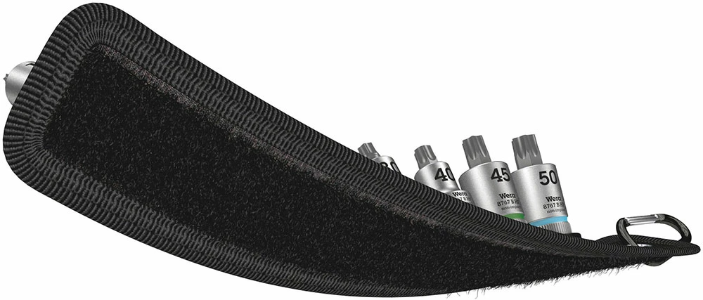 Sangle porte-outils en textile très résistant et design Wera, avec 9 douille-embouts, sur un espace réduit. Le mécanisme “Twist to Unlock”, très souple, assure un maintien en toute sécurité et un retrait facile des douilles.